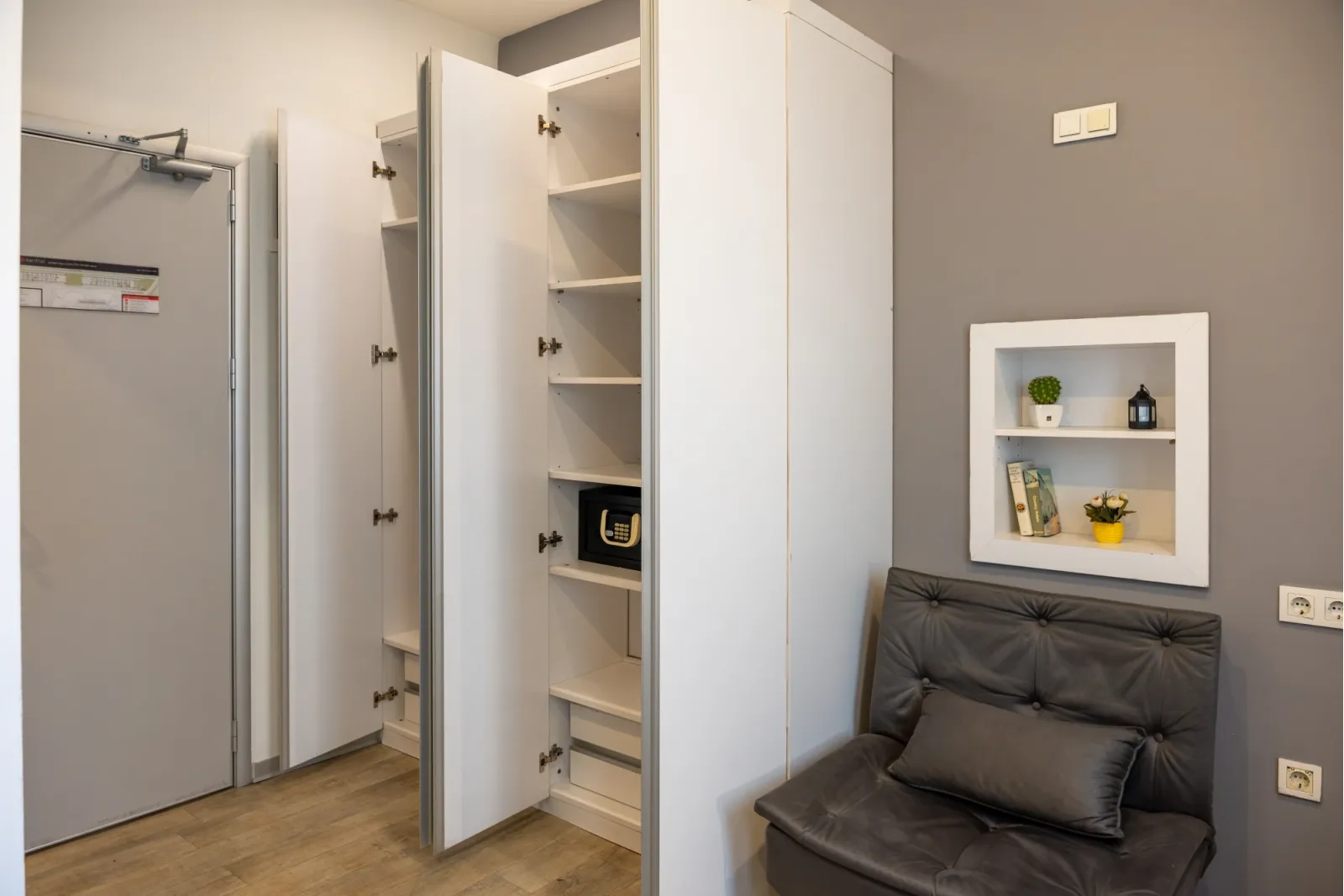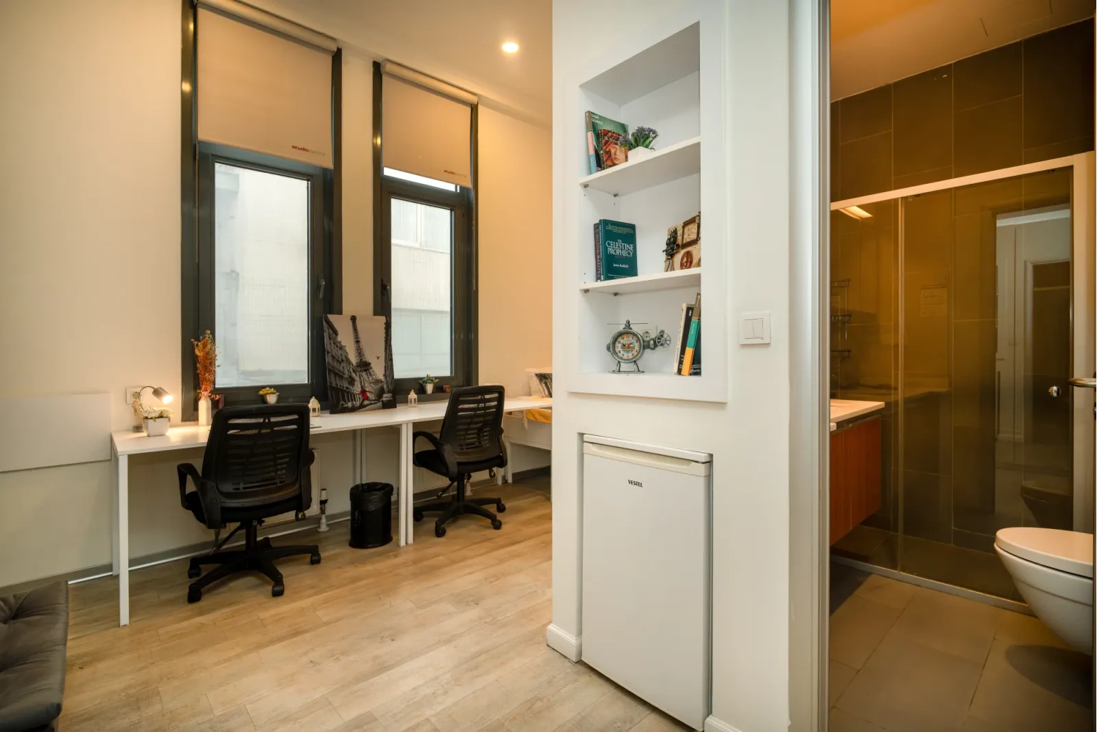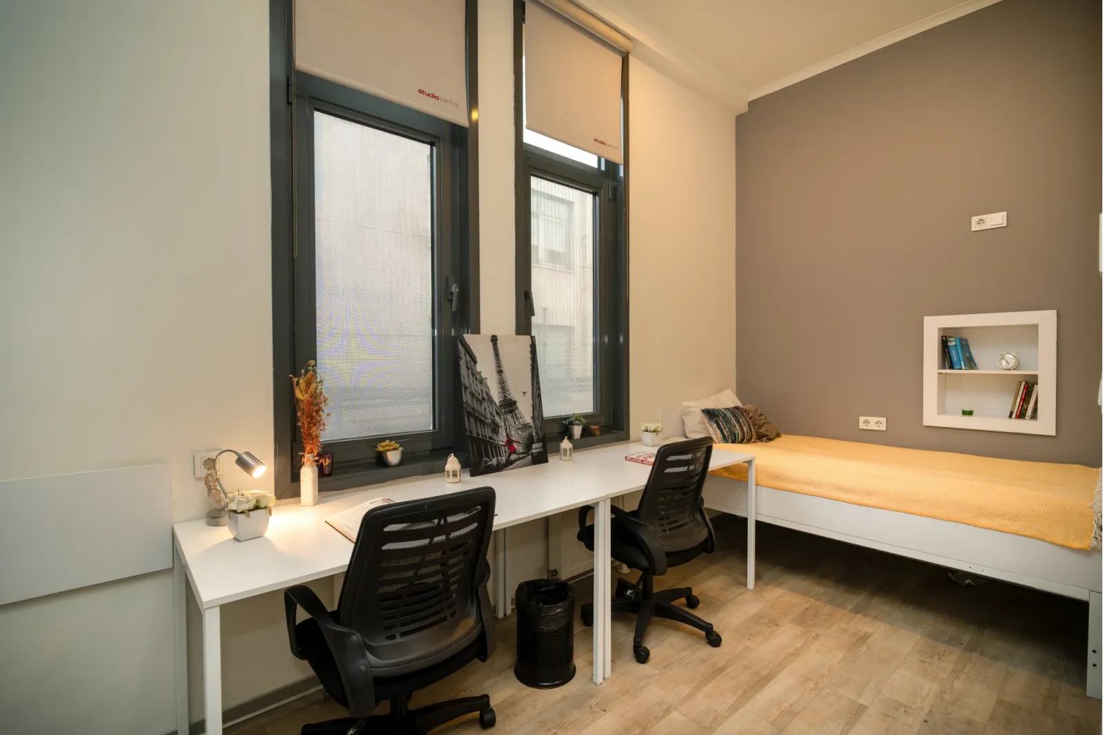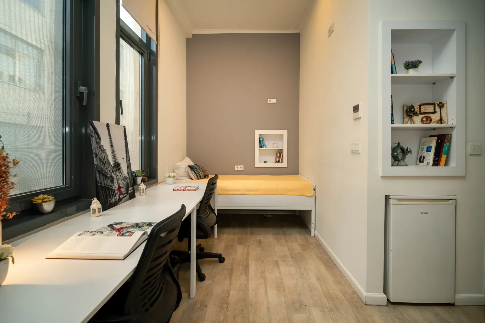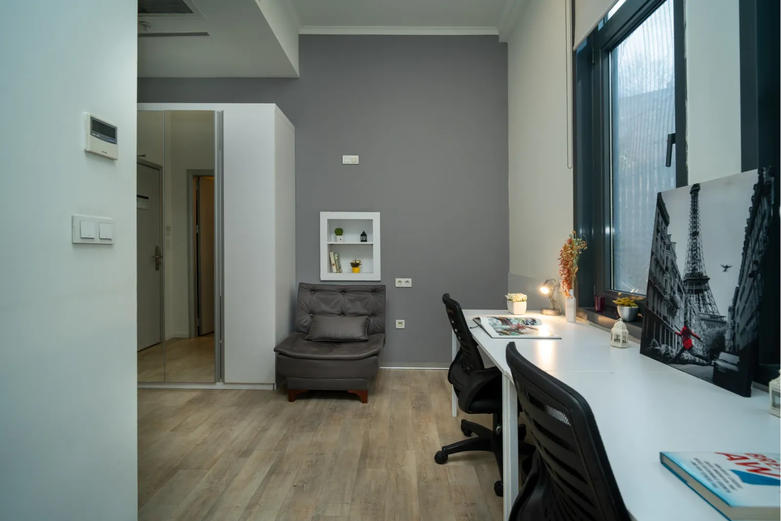 20 m²’lik alana sahip konforlu ve fonksiyonel iç yapısıyla modern tarzda dekore edilmiş odalarımızda mahremiyetine önem veren öğrencilerimiz için her detay düşünüldü.